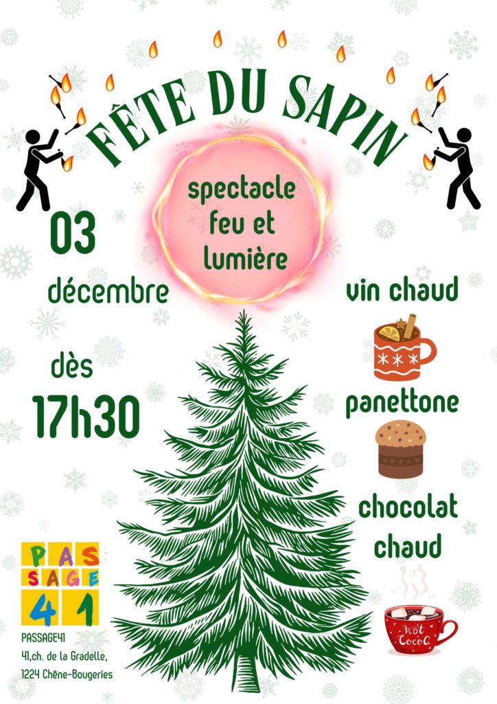 Fête du sapin Publication publiée : Le mercredi 3 décembre au pied du Sapin, venez profiter du spectacle « Feu et Lumières » et boire un vin chaud avant les fêtes de fin d’année! ouvert à toutes et tous!