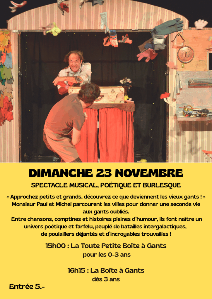 le 23 novembre, nous accueillerons Paul et Michel qui vous présenteront leur spectacle « La boîte à gants ». Deux représentations auront lieu. Un premier spectacle pour les 0-3 ans et un deuxième pour 3 ans et +. Attention places limitées, inscritptions recommandées au 022.349.44.49. Prix 5.-